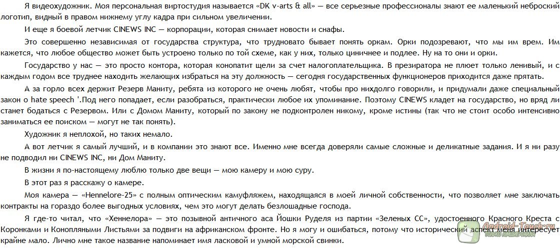 А под огромными «офшарами», висящими в атмосфере, раскинулась страна Уркаина, где в грязи и убожестве живут урки, они же орки, а правят ими уркаганы с властными именами – Рван Контекс, Рван Дюрекс... Между орками и людьми идёт постоянная война, которую снимают на камеры, чтобы дарить жителям офшаров их любимое развлечение – «снафы», смесь кинобоевиков и новостей. А что ещё делать, если возраст сексуального согласия в офшарах повышен до сорока шести лет?