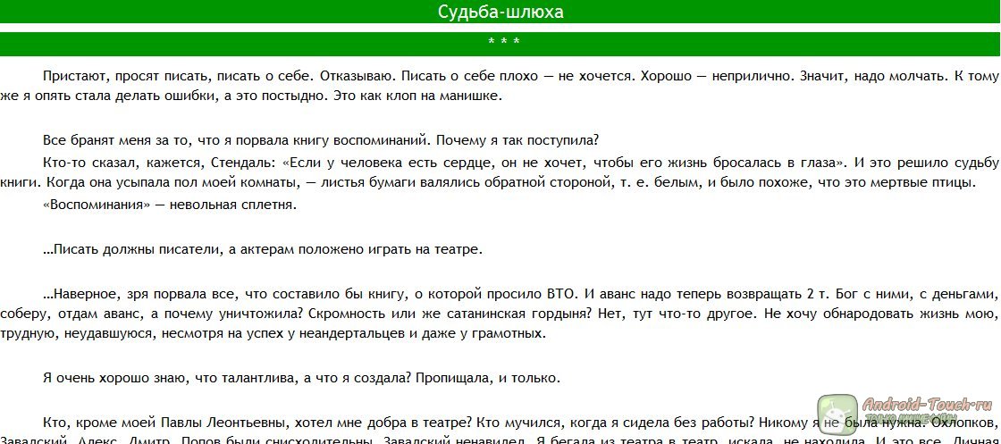Книгу «Судьба-шлюха» Раневская на самом деле написала, сама того не заметив. Она сама так и не взяла на себя труд оформить автобиографические записи в полноценную книгу: зачем? Получилась небольшая брошюрка, тонкая и до предела насыщенная фактами и эмоциями. Первая же страница книги – это сомнения. Со-мнения в голове у одного человека, которым оказывается там тесно – и они рвутся на бумагу.
