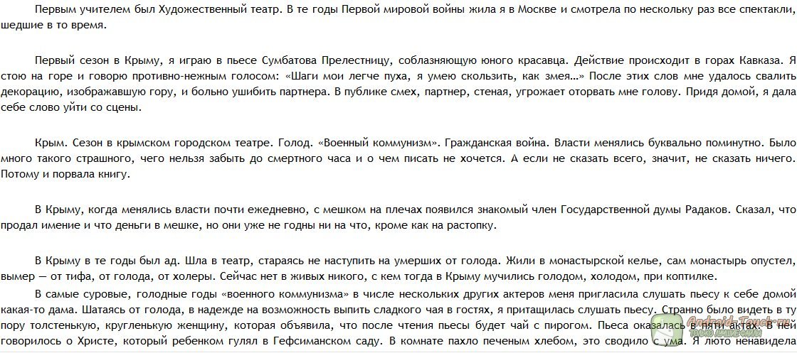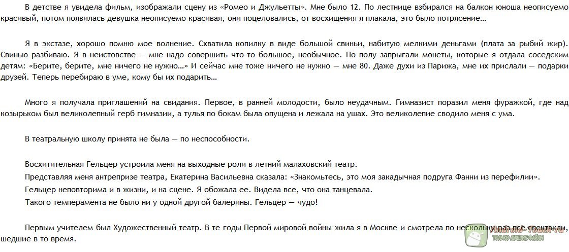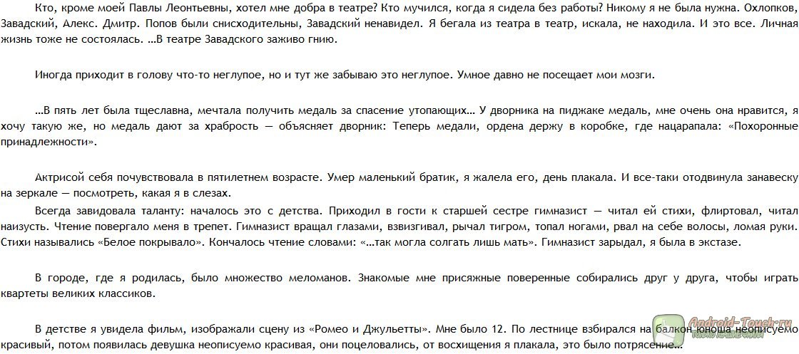 Это – лишь набросок той книги, которая могла бы быть. Но и в наброске помещается столько неудобства, дискомфорта, непонимания и тоски, что страшно подумать: а что если бы Раневская всё-таки написала эту книгу, полностью, безжалостно, как она это умела? Чудовищное получилось бы произведение. Талантливое и беспощадное. Может, и к лучшему, что книгу эту Раневская так и не написала? И всё-таки прочесть это надо.