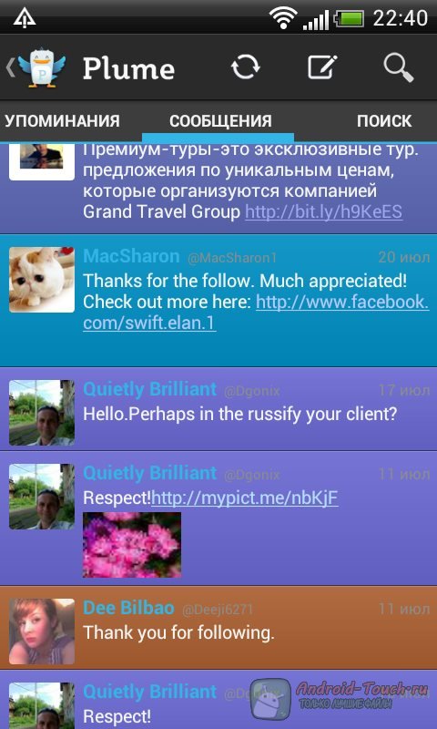 Первое, что бросается в глаза при запуске Plume – его скупой, но удобный интерфейс. В ленте нет ничего лишнего: аватар и имя пользователя, текст твита, время отправки, возможно, ссылки. Однако стоит поставить галочку в настройках – и на смену серости придёт буйная красочность. Вы можете и сами настроить цвета для различных пользователей, чтобы выделить в ленте твиты от избранных друзей, ваши собственные или с вашим упоминанием. Настройка интерфейса Plume – одно из главных его достоинств.