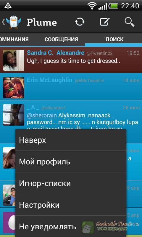 Чтобы перейти к опциям твита, надо тапнуть на нём, после чего откроется меню. Из меню вы сможете перепубликовать твит, ответить на него, занести в избранное или перейти к более продвинутым опциям.