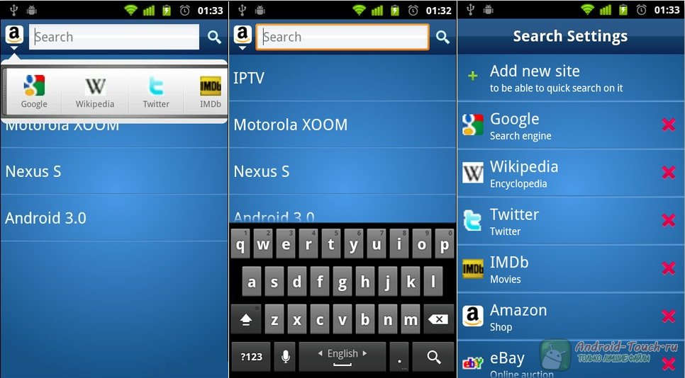 В своей основе интерфейс Extended Search схож со встроенным поиском Android. Для добавления сайтов в список присутствует специальный мастер, который сначала тестирует сайты на работоспособность, затем добавляет их в список. Работу с приложением облегчает виджет, через который доступен быстрый поиск – введите слово, выберите сайт для поиска. Результаты выводятся через браузер по умолчанию.Более того, в программе присутствует и голосовой поиск. Приятная опция, которая с распространением голосовых движков должна стать более востребованной. Программа сохраняет историю поиска.