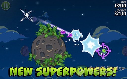 Итак, действие «Злых птичек» перенесено в космос. Этот ход – вывести сиквел за пределы Земли - часто используется и в кино, однако обычно он свидетельствует о кризисе идей для продолжения и особого успеха не приносит. Впрочем, кино – это кино, а игры – это игры. Здесь всё по-другому. Новый вид игры вызывает ассоциации с «Маленьким принцем» Экзюпери: теперь свиньи оккупировали небольшие астероиды и уныло сидят на них, а космическая рогатка с птичками размещена то на самой планете, то где-то на космической станции. Поскольку планетки окружены атмосферой, её сопротивление влияет на траекторию птиц: так что поначалу игра снабжается подсказкой, как будет птица «лететь» под данным углом запуска.