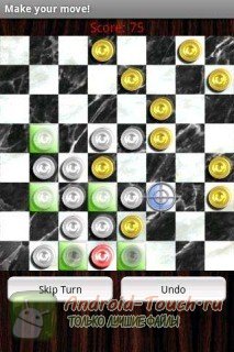 В начальной позиции на обычной шахматной доске у каждого игрока стоит по десять шашек, занимающих углы с a4 по d1 и с e8по h5. Задача игрока – переместить все свои шашки в угол противника, опередив его. При этом шашкой можно делать ход лишь на соседнее поле по вертикали или горизонтали или же перепрыгивать через стоящие рядом шашки, хоть свои, хоть чужие, если поле за ними – свободно. Комбинации прыжков за один ход могут быть сколь угодно длинными. В общем, правила классические. Выбрав шашку, Вы можете увидеть на поле варианты хода; впрочем, если Вам интереснее играть без подсказок, эту опцию можно и отключить. Настраиваются также способы перемещения шашки (по умолчанию тап нужно подтвердить после паузы, но при желании это можно и отключить, делая ход сразу) и звуковое оформление.