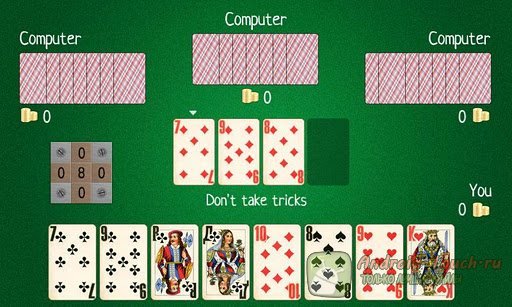 Кинг – игра с нулевой суммой, где сумма очков победителей равно недобору очков проигравших. Как это реализовано в приложении? Его авторы опирались на классическую версию Кинга 1993 года, написанную для MS-DOS. Правила там те же, очки округлены ровно в 10 раз, что никак не влияет на ход игры. По сравнению с классическими правилами здесь всё проще: отыгрыш проходит по тем же правилам, что и набор очков, круга с назначением козыря здесь нет. Играть можно как в одиночку против компьютерных противников, так и в компании, соединяясь друг с другом по Wi-Fi. Серверного режима с игрой через Интернет здесь пока нет.