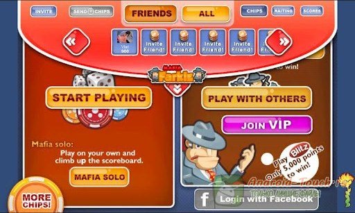 Бросая шесть костей, держите пальцы, чтобы выпали победоносные комбинации. Три единицы означают тысячу очков, три двойки – двести, но каждая последующая двойка также приносит двести. Особо ценятся комбинации 1-1-3-3-4-4 (750 очков-фишек) и 1-2-3-4-5-6 (1000 фишек). Скупость геймплея (выброшенные кости решают всё за игрока) компенсируется обилием социальных настроек. Здесь можно играть одному против виртуального противника или с подключением к Facebook, что даёт возможность публиковать результаты. В этом случае смысл игры – в том, чтобы подниматься выше в таблице рекордов. Можно играть против самого себя на Facebook – неплохое отзеркаливание! Ну и, естественно, можно пригласить в игру своих друзей из популярнейшей социальной сети и играть против них на ставку.