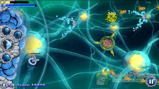 Впрочем, у Вас есть способ отбиваться антителами. Делайте жесты от края клетки навстречу агрессору, чтобы выпустить навстречу контратакующий отряд. По мере разгона антигены уничтожат злобные вирусы. Целиться нужно точно, чтобы тратить меньше ресурсов. В левой верхней части экрана вы можете видеть два индикатора: синий, показывающий здоровье, и жёлтый, отображающий запасы энергии в митохондриях.