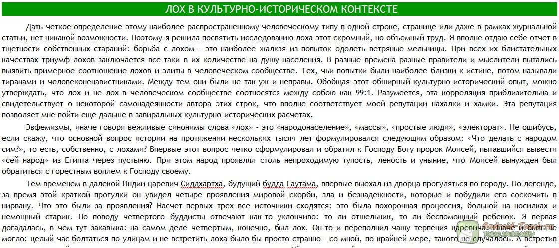 Вот и в книге «Энциклопедия лоха» Ксюша осовременивает бессмертное гоголевское «Над кем смеётесь?» Разумеется, книга крайне спорная. Естественно: по Ксюшиной классификации лохами оказываются даже не 95%, а все 99% человечества. Но прежде чем осуждать гражданку Собчак за мизантропию и самолюбование, следует вспомнить, в каких кругах она вращается. Освежить в памяти, за что же Вы так ненавидите «Дом-2» - уж явно не за участие Ксюши. Окинуть свежим взглядом всю вынесенную элиту (а может, всё-таки всплывшую?) И странное дело – с очень многими утверждениями из этой книги хочется согласиться.