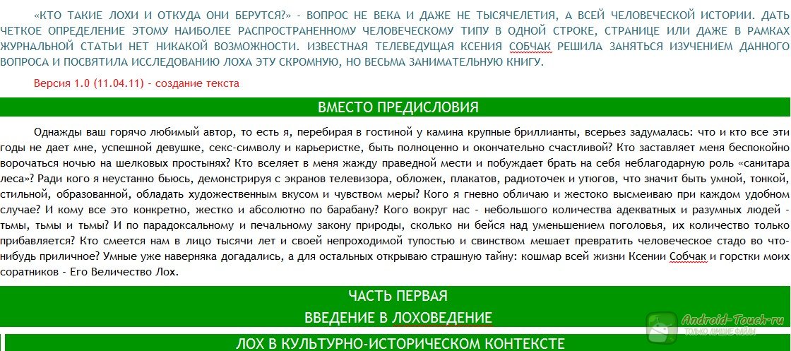 Книга Энциклопедия лоха от Ксении Собчак Анатольевны в формате fb2 а так же ePub формате для смартфонов: Samsung Galaxy S II I9100, HTC EVO 3D + Incredible S + Desire HD, Motorola Atrix 4G + Milestone 2 + XT701, LG Optimus 3D P920, HTC Sensation, Sony Ericsson Xperia Arc S, Google Nexus S, Acer Liquid, Garmin-Asus A10, Huawei Ideos U8150 и других моделей.