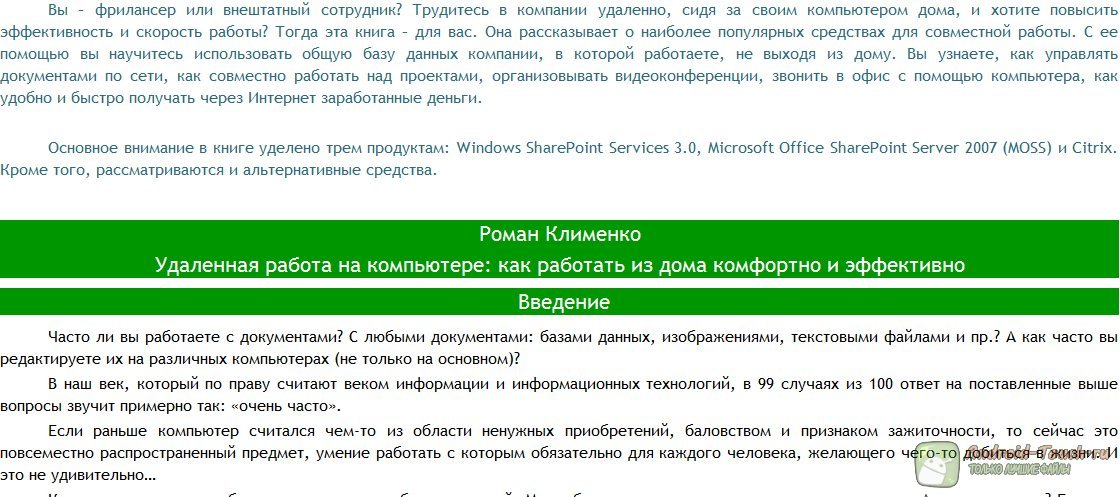 Однако самый практичный вариант - это фриланс, позволяющий, оставаясь дома физически, воспользоваться всеми преимуществами работы в команде. В первую очередь книга посвящена программным решениям, с помощью которых в Интернете можно обеспечить совместную работу. Это Windows Share Point Services, Microsoft Office Share Point Services и Citrix. Для чего нужны эти приложения? В первую очередь – для согласованной синхронизации данных. Если вы работаете в команде над проектом, требующим слаженной работы, то, где бы и находились Вы физически, Ваши результаты должны быть доступны на сервере организации в любой момент.
