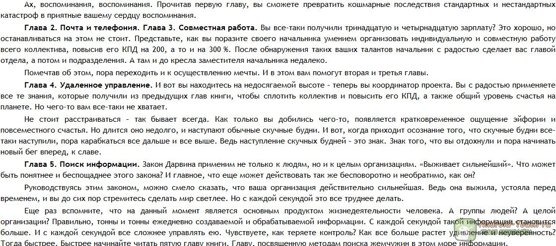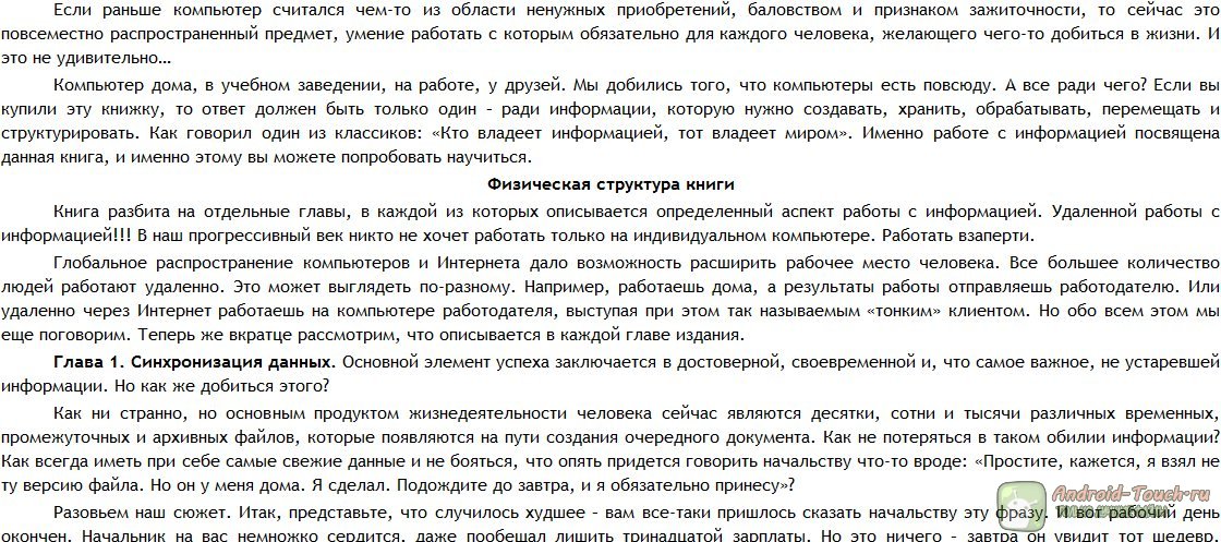 Отдельный разговор – синхронизация мобильных устройств. Поскольку автор сосредоточен на корпоративной тематике, то он в первую очередь освещает работу с Windows Mobile. Наш любимый Android, как ни обидно, не упоминается в книге ни разу. В книге также содержатся инструкции по работе с платёжными системами Интернета (в частности, Webmoney), советы по оптимизации работы с поисковыми системами и много полезной информации. Даже если Вы не относитесь к «удалённым сотрудникам», книга наверняка поможет Вам облегчить себе жизнь во многих отношениях.