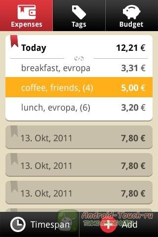 Развитая система тегов позволит Вам тратить минимум времени на систематизацию записей – достаточно выбрать подходящий тег из списка. Разумеется, если Вы достаточно владеете английским. Если же нет – можете создавать кириллические теги самостоятельно. Кроме тегов, в запись по каждому расходу входит его дата, время, периодичность и краткий комментарий.
