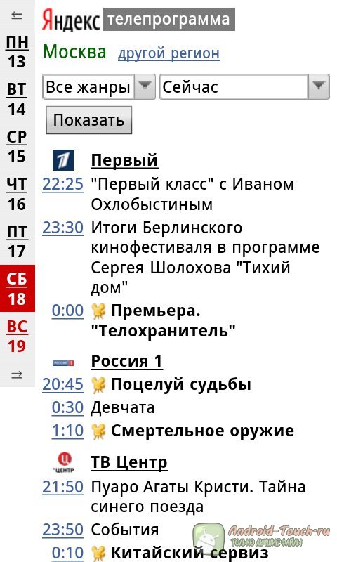 В такое приложение так и просится функция напоминания – и она здесь есть, интегрированная в сервис Яндекс.Календарь. Несколько странно, что нет возможности добавить событие в календарь Google – всё-таки это приложение для Android. Нужную программу можно добавить туда буквально одним тапом. Можно выбрать город вещания (по умолчанию это - Москва). Конечно, можно воспользоваться этим сервисом и через браузер, тем более программа, по сути, использует браузерный вид. Однако приложение имеет преимущества, в первую очередь это – экономия трафика и быстрый доступ к нужной информации. И да, эта версия от некого zekеrsа, данная разработка не имеет прямого отношения к разработкам Яндекса. Так что в случае каких-то недочетов при работе лучше напишите автору прогарммы, координаты в ней имеются.