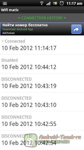 В число дополнительных функций также входит ведение журнала включения/отключения Wi-Fi, что порой может помочь, если надо восстановить в памяти картину дня. Когда Вы были в офисе? Когда зашли в ресторан с покрытием Wi-Fi и когда оказались дома, в зоне действия своего роутера? Все эти события пишутся в журнал программы. Соблазнительно было бы применить GPS для запоминания мест, однако автор сознательно отказался от такой идеи. Дело в том, что использование энергоёмкого GPS свело бы на нет главный эффект от программы – экономию заряда.