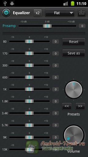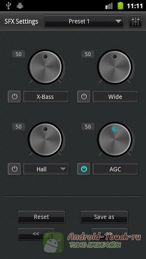 В настройках плейера можно включить программные улучшения для звука – доступны такие эффекты, как BBE, BBE ViVA, Wide, Reverb, X-Bass. К тому же десятиполосный эквалайзер позволяет вам как подгружать уже готовые пресеты, так и настраивать звук самостоятельно.