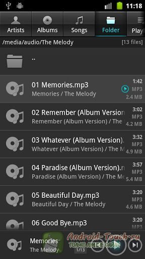 Поддерживаются самые разные форматы аудиофайлов: wav, .mp3, .ogg, .flac, .m4a, .mpc, .tta, .wv, .ape, .mod, .spx, это должно обрадовать не только простых любителей музыки, но и, к примеру, людей, перешедших на Android с техники Apple, ценителей lossless-записей или фанатов трекерной музыки. Основной экран программы позволяет не только управлять воспроизведением, но и показывает подробную информацию о композиции, включая обложку диска и ссылку на текст песни, а также текущий режим воспроизведения, уровень громкости и навигационный ползунок.