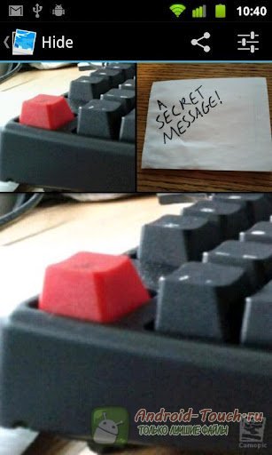 Пользоваться приложением просто: в главном меню нужно выбрать пункт Hide a Picture(«Спрятать картинку»). Изображения нужно будет выбрать два: одно – то, что Вы хотите переслать, другое – то, которое хотите использовать для маскировки. Использовать можно как изображения из галереи, так и снимки с камеры Вашего смартфона.