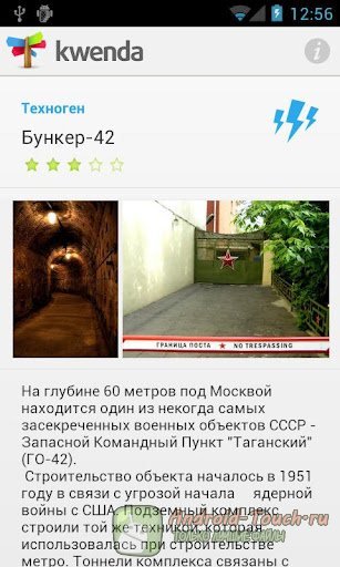 Мобильное приложение Kwenda позволяет узнать больше о месте, где Вы находитесь. О ближайших достопримечательностях – возможно, Вы уже проходите мимо интереснейшего места. Работает тематический поиск по видам объектов (музеи, храмы, памятники, природа, артефакты, археология и так далее). Есть даже отдельный пункт меню для туристов-экстремалов: заброшенные объекты, бункеры, ДЗОТы и шахты. Использование общедоступных ресурсов и Интернета делает размер приложения крошечным – менее 250 килобайт. Но оно делает мир вокруг нас ещё более безграничным.