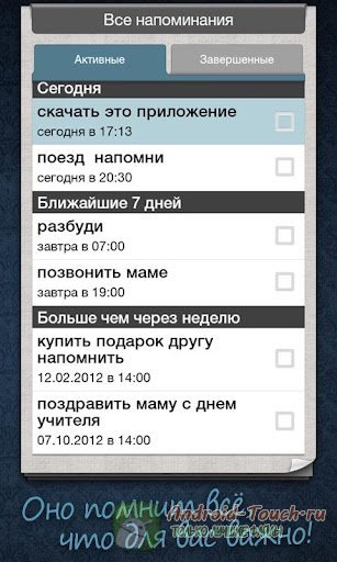 Не поверите – реально. И все эти возможности скрываются в программе под красноречивым названием «Помнить Всё». Что именно – всё? Да всё что угодно. Задайте название события, время, дату просто голосом. Не надо даже строить фразу специальным образом. Скажите: «Завтра в пол-седьмого встреча на вокзале». Или «В пять-пятнадцать сериал по первому». Программа распознает и правильно интерпретирует Вашу речь!