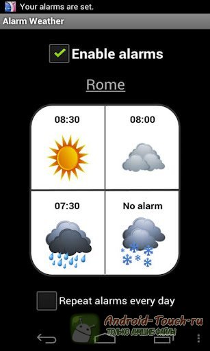 Разумеется, присутствует и обычная функциональность будильника. Настраивается сигнал, повтор будильника, время, на которое сигнал откладывается, и другие привычные элементы. Можно настроить будильник и на ежедневный повтор. В общем, даже если не учитывать погодных сервисов, вполне достойный программный будильник. Среди языков, на которых доступен интерфейс Alarm Weather, русского пока нет. Есть английский, для большинства пользователей этого должно быть достаточно.