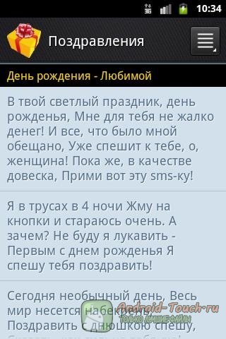 Что умеет данное приложение? А что Вас интересует в отправке? Найти какой-то хороший текст для СМС - да, эта программа поможет Вам за считанные секунды найти то, что больше всего подходит для нее, для него, для друга, для семьи, родителей и родственников! Не копируя и не перепечатывая сообщение отправить со своего номера за пару секунд - ну конечно, ведь разработчик предусмотрел все! Широкий выбор поздравлений - да! На данный момент программа содержит более 600 смс-ок, причем как серьезного, так и юморного характера!
