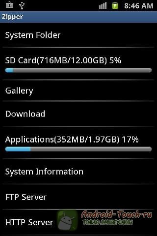 Для тех, кто часто работает с удалёнными серверами, особую ценность представляет поддержка соединения по FTP. Причём это не только соединение с удалённым сервером. Встроенный FTP- и HTTP-сервер позволяет Вам работать с файловой системой смартфона или планшета через браузер компьютера. Отдельным блоком вынесен набор системных приложений. Это вполне неплохой таск-киллер и вывод информации о системе (нагрузка процессора, состояние памяти, сетевые подключения, заряд батареи и так далее).