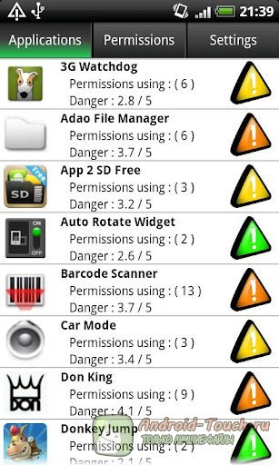 На основании сверки со своей базой «сторожевой пёс» может оценивать уровень безопасности системы. Если разрешений программа требует много, то безопасность смартфона или планшета с такой программой вызывает недоверие, и программа сама подскажет Вам, на какие приложения стоит обратить пристальное внимание.