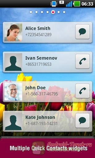 Как и другие виджеты, Quick Contacts предлагает нам работать с ним прямо с рабочего стола. Традиционно виджет активируется с помощью долгого тапа на рабочем столе, из меню Вы выбираете добавление виджета, из списка виджетов – «Быстрые контакты». А выбрав его, Вы снова оказываетесь в списке телефонных номеров. Выберите из списка номер – и он появится на Вашем рабочем столе в формате 4х1. Если же Вы используете оболочку вроде GO Launcher EX, то размер виджета можно и изменить. Для обладателей смартфонов с небольшим разрешением экрана это будет полезно: поскольку виджет показывает пиктограмму контакта, то по ней вполне можно ориентироваться, не видя имени.
